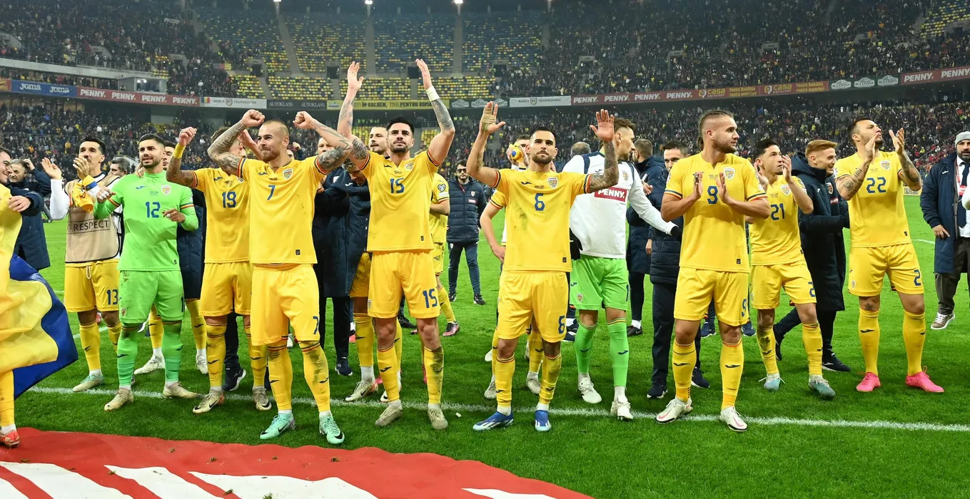 Fotbalistii romani Andrei Artean,Denis Alibec,Andrei Burca, Marius Marin, George Puscas, Olimpiu Morutan si Vasile Mogos saluta publicul dupa meciul de fotbal dintre Romania si Elvetia, din cadrul preliminariilor Campionatului European 2024, desfasurat pe Arena Nationala, marti 21 noiembrie 2023. © FOTO:Razvan Pasarica/SPORT PICTURES