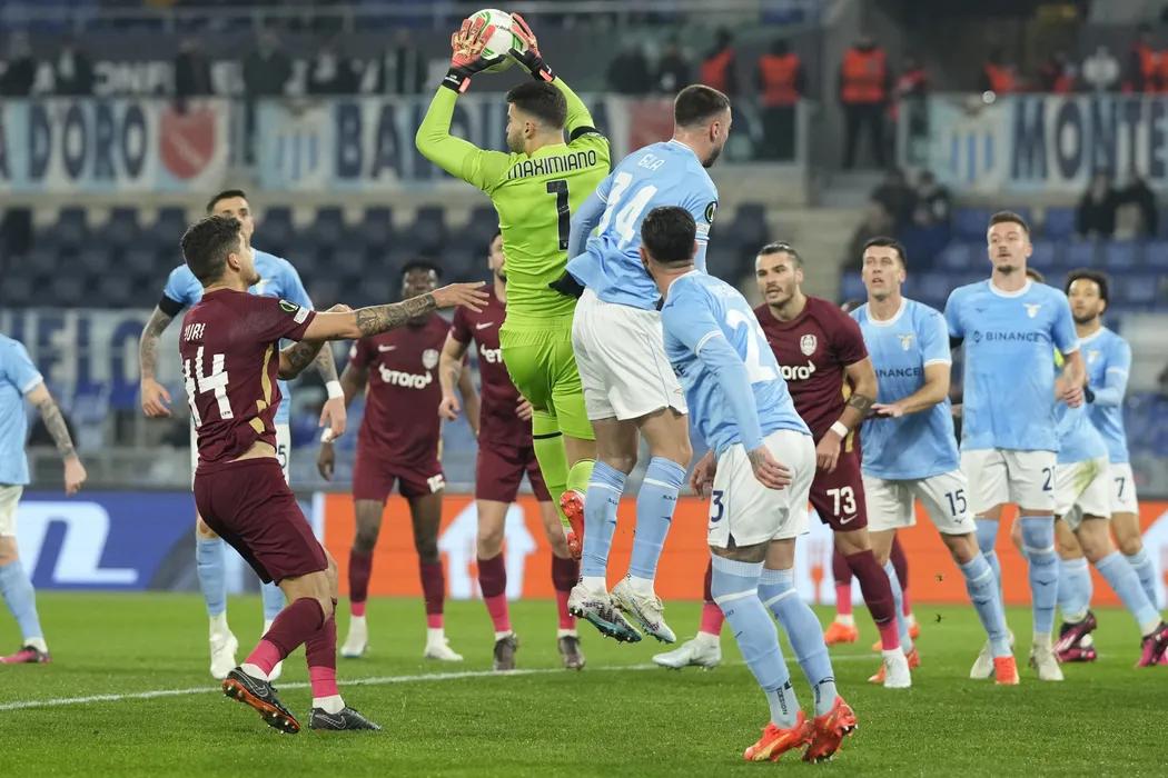 Lazio's goalkeeper Luis Maximiano saves ball during an Europa Conference League playoff first leg soccer match between Lazio and CFR Cluj, at Rome's Olympic Stadium, Thursday, Feb. 16, 2023. (AP Photo/Andrew Medichini)