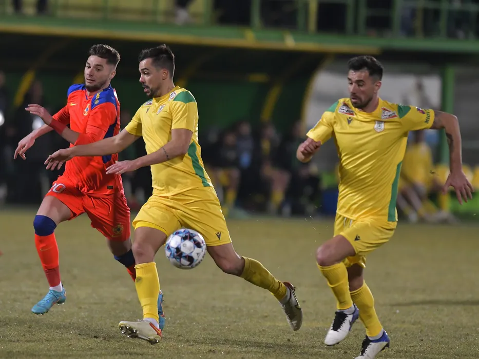 Andrei Burlacu, Alexandru Iacob si Ionut Balaur in meciul de fotbal dintre CS Mioveni si FCSB, contand pentru Liga 1 Casa Pariurilor, desfasurat pe Stadionul Orasenesc din Mioveni, sambata 19 februarie 2022. © FOTO:Razvan Pasarica/SPORT PICTURES