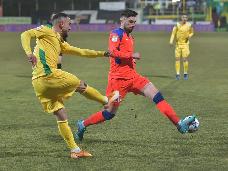 Mihai Andrei Panait si Andrei Burlacu in meciul de fotbal dintre CS Mioveni si FCSB, contand pentru Liga 1 Casa Pariurilor, desfasurat pe Stadionul Orasenesc din Mioveni, sambata 19 februarie 2022. © FOTO:Razvan Pasarica/SPORT PICTURES