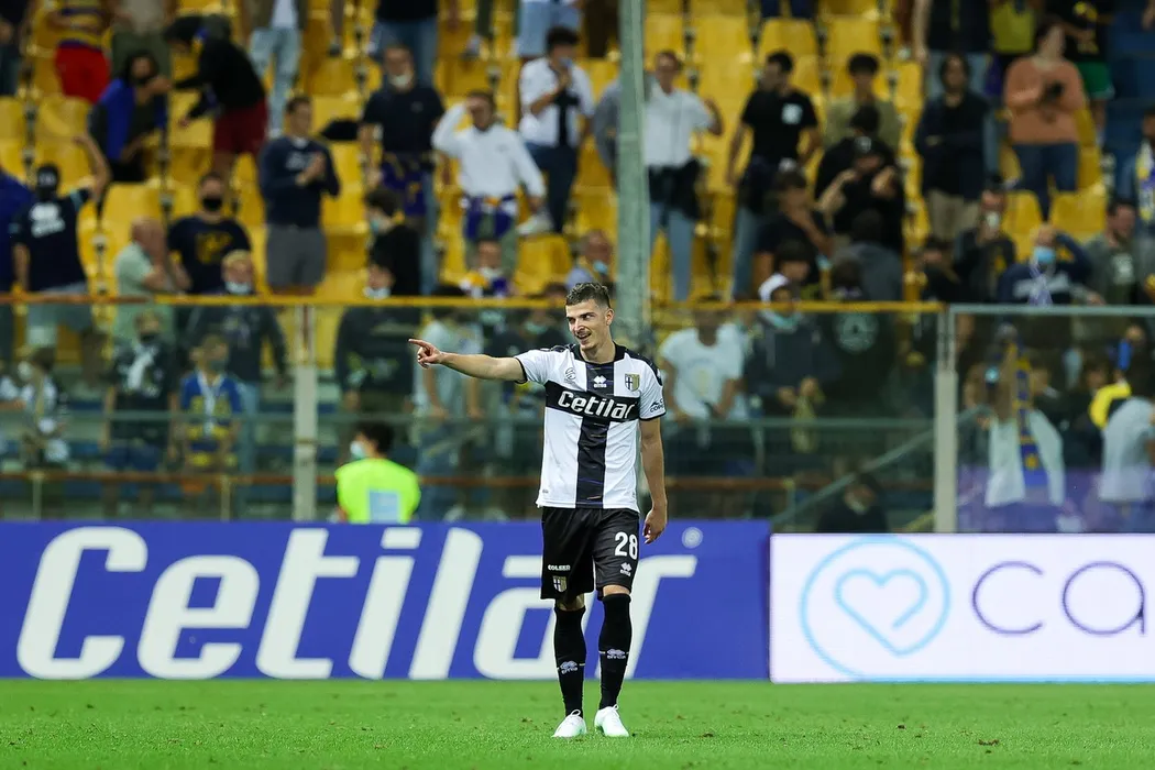 29 agosto 2021 - Parma, Italia sport, calcio Parma Vs Benevento - Campionato di calcio Serie BKT 2021/2022 - Stadio Ennio Tardini. Nella foto: Valentin Mihaila esulta per il goal dell'1-0 August 29, 2021 - Parma, Italy sport, soccer Parma Vs Benevento - Italian Football Championship League BKT 2021/2022 - Ennio Tardini Stadium. In the pic: Valentin Mihaila celebrates after scoring his team's first goal with his teammates,Image: 629378115, License: Rights-managed, Restrictions: , Model Release: no, Credit line: Profimedia