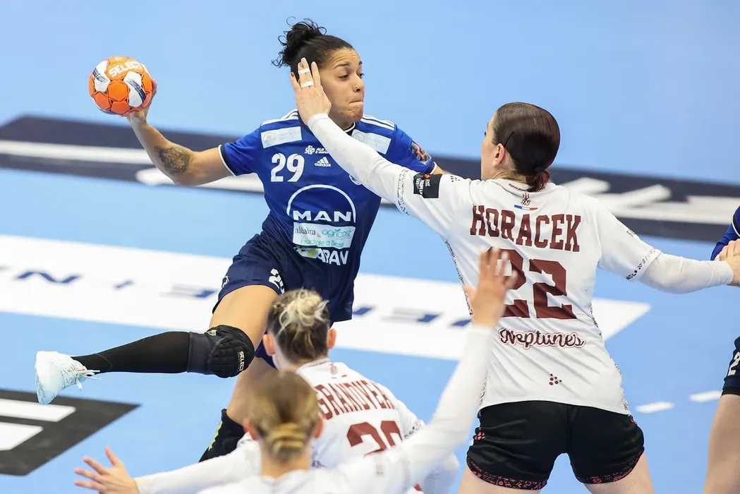 Francielle Gomes Da Rocha în meciul de handbal dintre HC Dunărea Brăila, și Neptunes Nantes, contând pentru Finala mică EHF EL, desfășurat în Raiffeisen Sportpark din Graz, duminică 12 mai 2024. © FOTO: Sorin PANĂ/SPORT PICTURES
