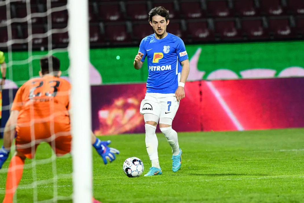 Alexi Pitu, de la Farul Constanta, suteaza in timpul meciului de fotbal contra echipei CFR Cluj din etapa a 7- a a play-off-ului Ligii 1, disputat pe stadionul Dr. Constantin Radulescu, duminica, 1 mai 2022. FLAVIU BUBOI / MEDIAFAX FOTO