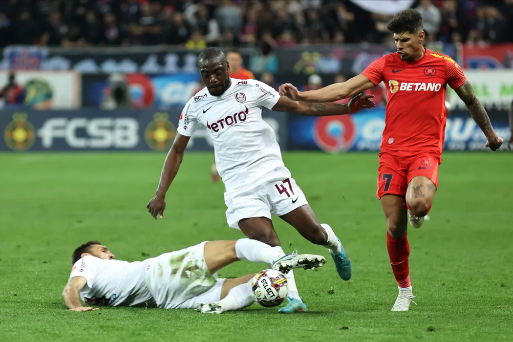 Christopher Braun (S), de la CFR Cluj, lupta pentru balon cu Florinel Coman (D), de la FCSB, in meciul de fotbal din etapa a VIII-a a play-off-ului Superligii, disputat pe Arena Nationala din Bucuresti, duminica, 14 mai 2023. GEORGE FILIP/ MEDIAFAX FOTO