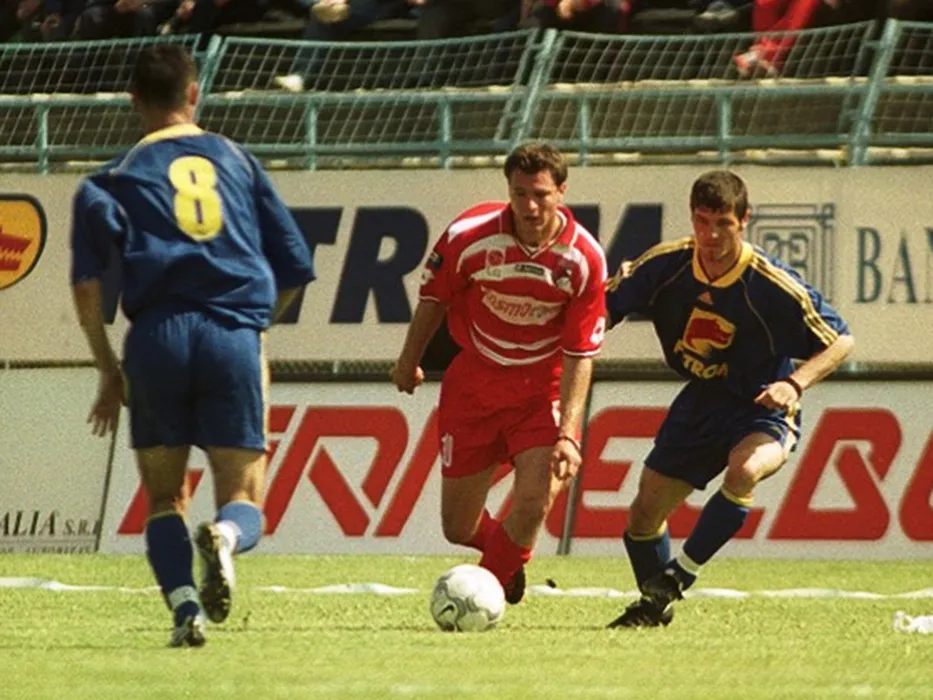 Marius Niculae si Vasile Lupsa in meciul de fotbal dintre Petrolul Ploiesti si Dinamo Bucuresti, desfasurat pe Stadionul Ilie Oana din Ploiesti, miercuri 2 mai 2001. © FOTO:Razvan Pasarica/SPORT PICTURES
