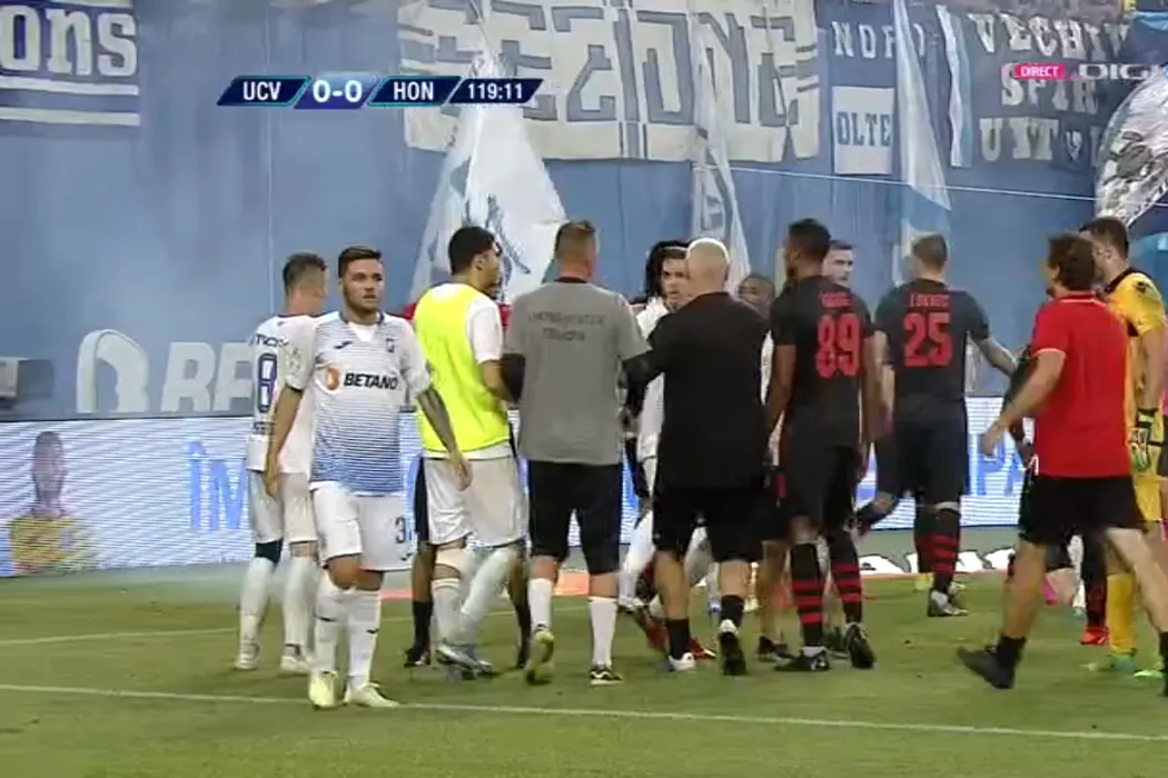 INCREDIBIL! Fanii olteni au scăpat de sub control. O petardă și un obiect l-au doborât pe arbitrul meciului U Craiova – Honved. Ungurii au cerut oprirea meciului