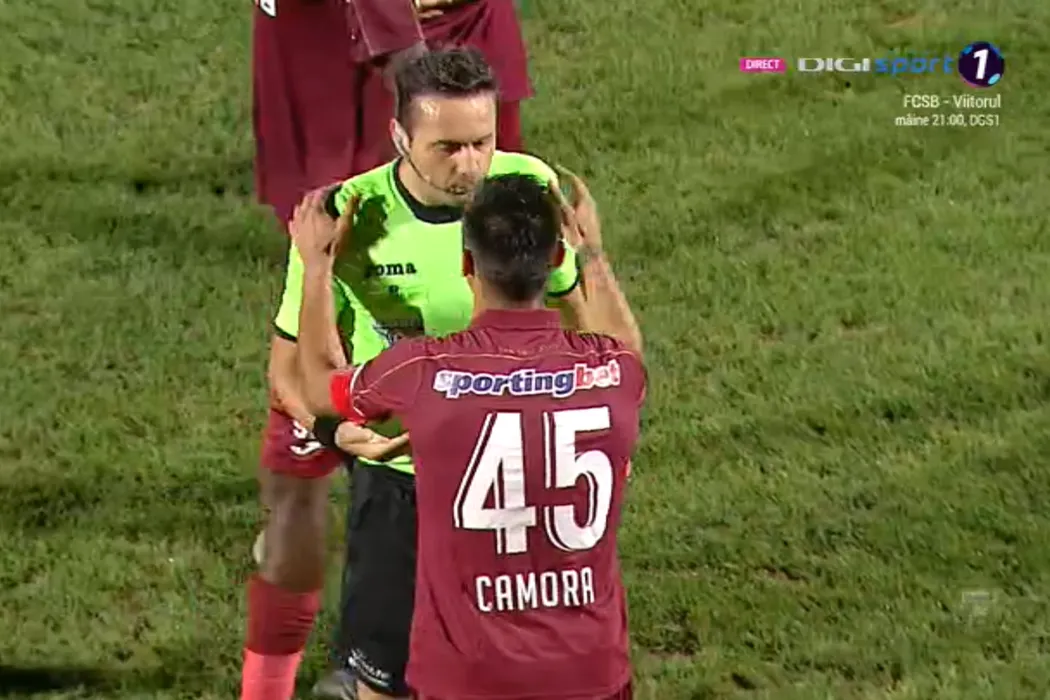 Incredibil! Mario Camora, eliminat după ce a trântit o sticlă cu apă pe teren. Sebastian Colțescu, decizie de neînțeles + Dan Petrescu și Vâtcă au văzut și ei cartonașul roșu