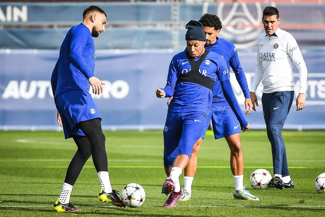 Gianluigi DONNARUMMA of PSG, Kylian MBAPPE of PSG and MARQUINHOS of PSG during the training of the Paris Saint-Germain team on October 10, 2022 at Camp des Loges in Saint-Germain-en-Laye near Paris, France - Photo Matthieu Mirville / DPPI