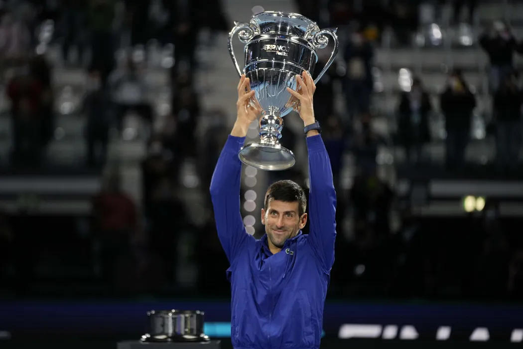 Serbia's Novak Djokovic holds the trophy as ATP world best player, at the Tennis ATP World Tour Finals, at the Pala Alpitour in Turin, Monday, Nov. 15, 2021. (AP Photo/Luca Bruno)
