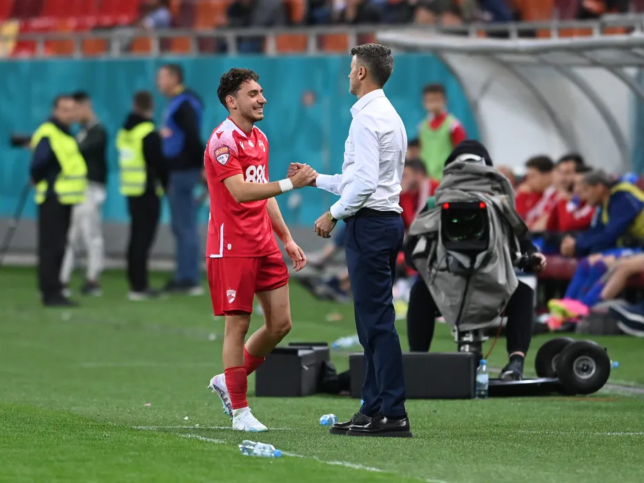 Ahmed Mustafa Bani este felicitat de catre Ovidiu Burca la iesirea din teren din meciul de fotbal dintre Dinamo Bucuresti si CSA Steaua Bucuresti, contand pentru Play-off-ul Ligii a-2-a Casa Pariurilor, desfasurat pe Arena Nationala din Bucuresti, luni 15 mai 2023. © FOTO:Razvan Pasarica/SPORT PICTURES
