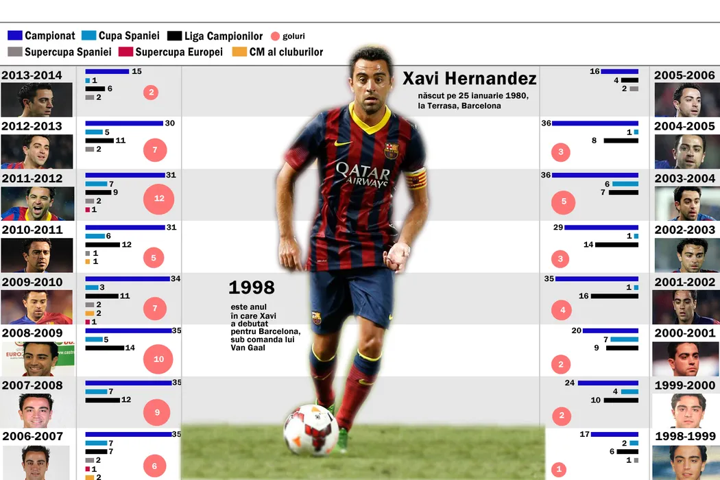 INFOGRAFIE #Xavi700! „Creierul” joacă de 16 ani în tricoul Barcelonei! Doi madrileni îl depășesc în acest top