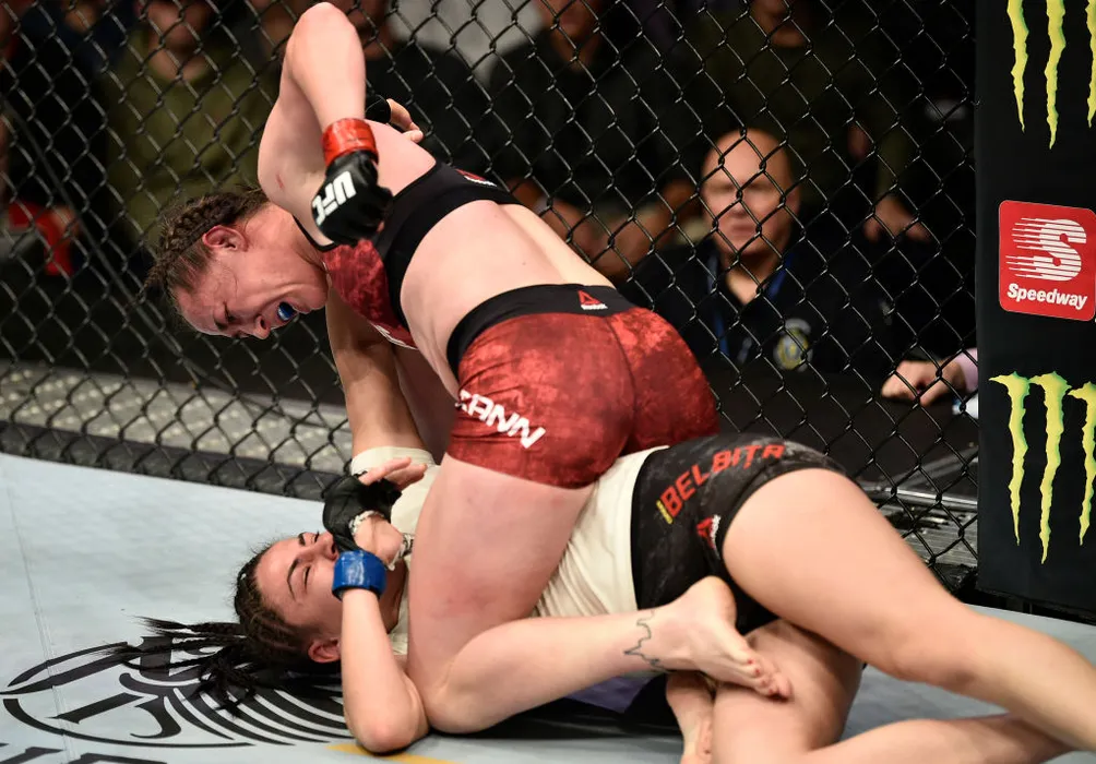 BOSTON, MASSACHUSETTS - OCTOBER 18: (R-L) Molly McCann punches Diana Belbita in their flyweight bout during the UFC Fight Night event at TD Garden on October 18, 2019 in Boston, Massachusetts. (Photo by Chris Unger/Zuffa LLC via Getty Images)