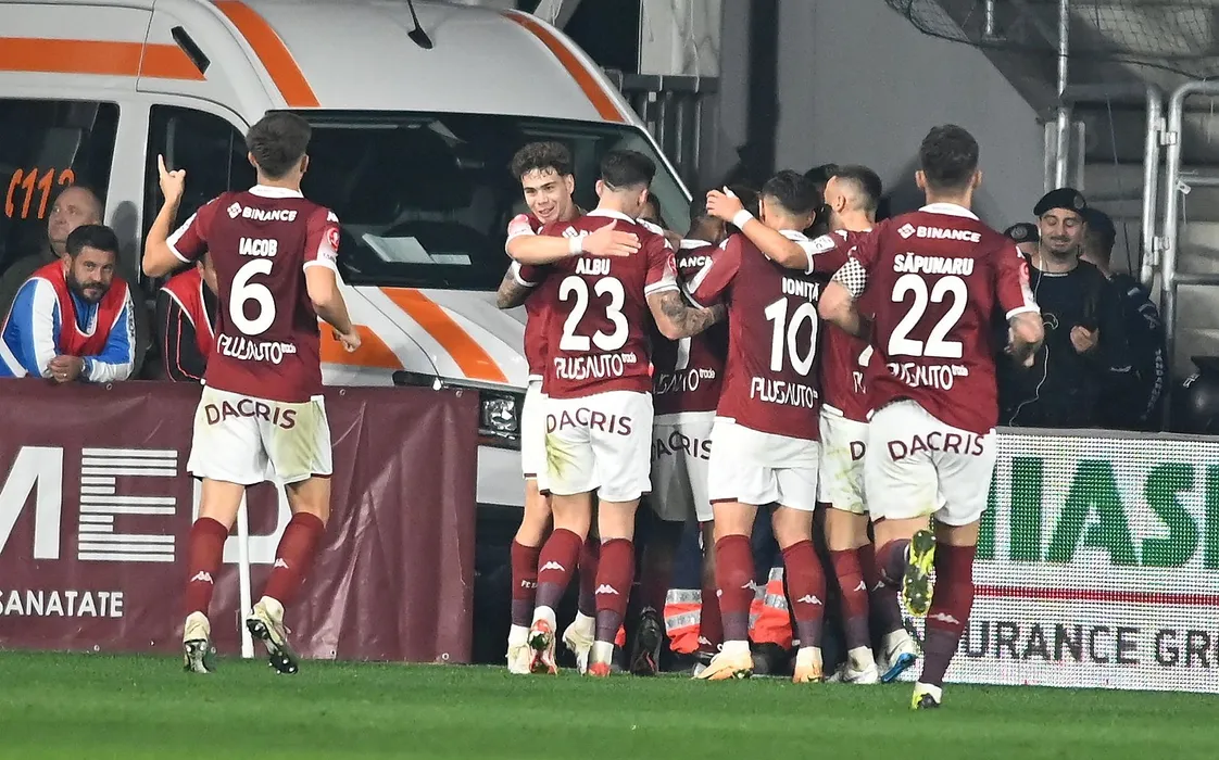 Bucurie a fotbalistilor rapidisti dupa un gol marcat cu Sebastian Andrei Borza si Paul Alexandru Iacob in meciul de fotbal dintre Rapid Bucuresti si Universitatea Craiova, din cadrul Superligii Superbet, desfasurat pe Superbet Arena-Giulesti din Bucuresti, duminica 29 octombrie 2023. © FOTO:Razvan Pasarica/SPORT PICTURES