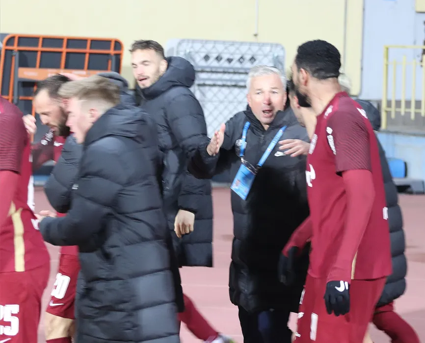 Fotbalistii clujeni se bucura dupa un gol marcat alaturi de antrenorul Dan Petrescu in meciul de fotbal dintre Gaz Metan Medias si CFR Cluj, contand pentru Liga 1 Casa Pariurilor, desfasurat pe Stadionul Municipal din Medias, sambata 12 februarie 2022. © FOTO:Macrea Valentin/SPORT PICTURES