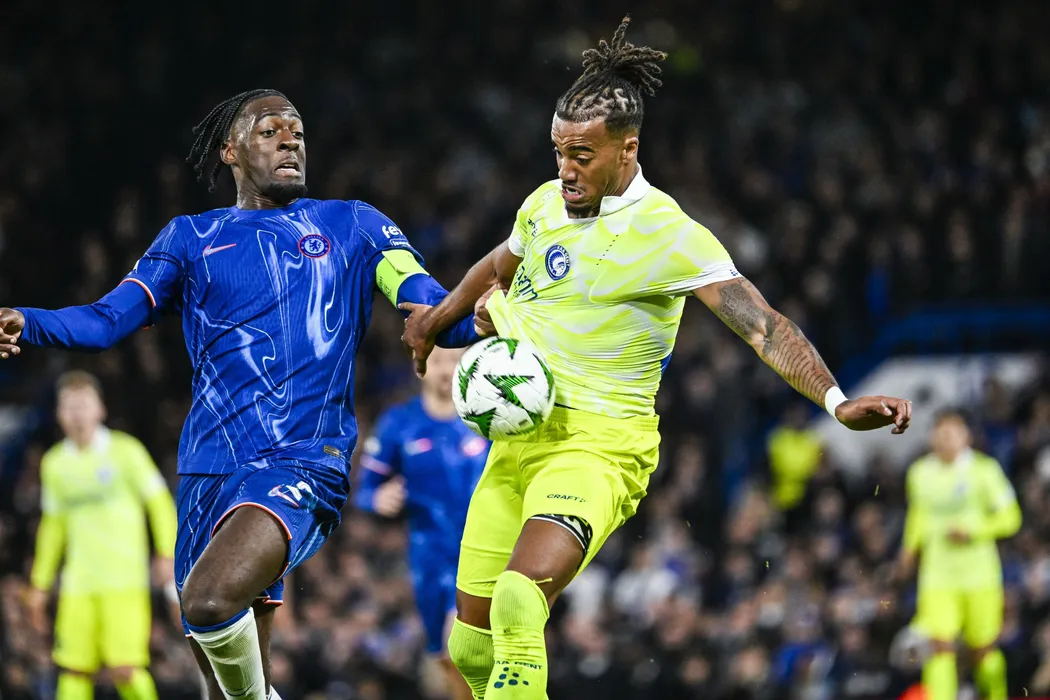 October 3, 2024, London, United Kingdom: Chelsea's Axel Disasi and Gent's Archibald Archie Brown pictured in action during a soccer match between British team Chelsea FC and Belgian team KAA Gent, Thursday 03 October 2024 in London, for the opening day of the UEFA Conference League tournament. (Credit Image: © Tom Goyvaerts/Belga via ZUMA Press)