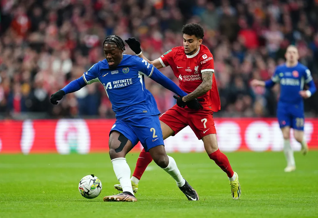 25 February 2024, United Kingdom, London: Chelsea's Axel Disasi and Liverpool's Luis Diaz (R) battle for the ball during the English Carabao Cup final soccer match between Chelsea and Liverpool at Wembley Stadium. Photo: Nick Potts/PA Wire/dpa