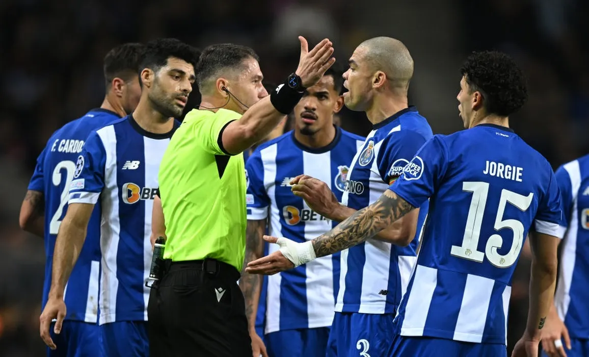 PORTO, PORTUGAL - DECEMBER 13: Pepe of FC Porto talks to referee, Istvan Kovacs during the UEFA Champions League match between FC Porto and FC Shakhtar Donetsk at Estadio do Dragao on December 13, 2023 in Porto, Portugal. (Photo by Octavio Passos/Getty Images)