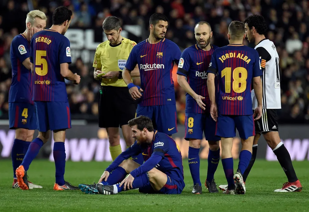 Barcelona's Argentinian forward Lionel Messi (bottom) sits on the field surrounded by teammates (L-R) Barcelona's Croatian midfielder Ivan Rakitic, Barcelona's Spanish midfielder Sergio Busquets, Barcelona's Uruguayan forward Luis Suarez, Barcelona's Spanish midfielder Andres Iniesta and Barcelona's Spanish defender Jordi Alba as Spanish referee Alberto Undiano Mallenco (3L) writes down during the Spanish 'Copa del Rey' (King's cup) second leg semi-final football match between Valencia CF and FC Barcelona at the Mestalla stadium in Valencia on February 8, 2018.,Image: 362685843, License: Rights-managed, Restrictions: , Model Release: no