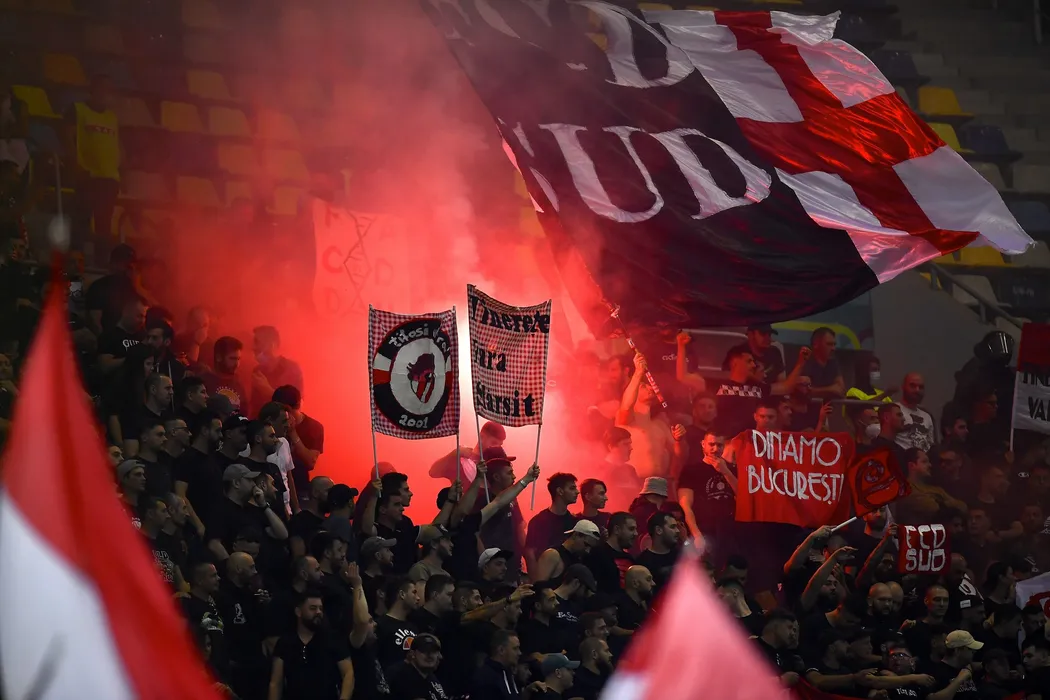 Suporterii formatiei Dinamo Bucuresti reactioneaza in timpul meciului de fotbal contra echipei FCSB din etapa a VIII-a a Ligii 1, disputat pe Arena Nationala din Bucuresti, duminica, 12 septembrie 2021. ALEX NICODIM / MEDIAFAX FOTO
