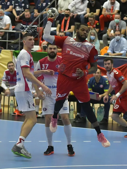 Denis Vasilev si Cedric Sorhaindo in meciul de handbal masculin dintre Dinamo Bucuresti si HC Motor Zaporozhye, contand pentru Liga Campionilor, desfasurat in Sala Dinamo din Bucuresti, joi 9 decembrie 2021. © FOTO:Razvan Pasarica/SPORT PICTURES