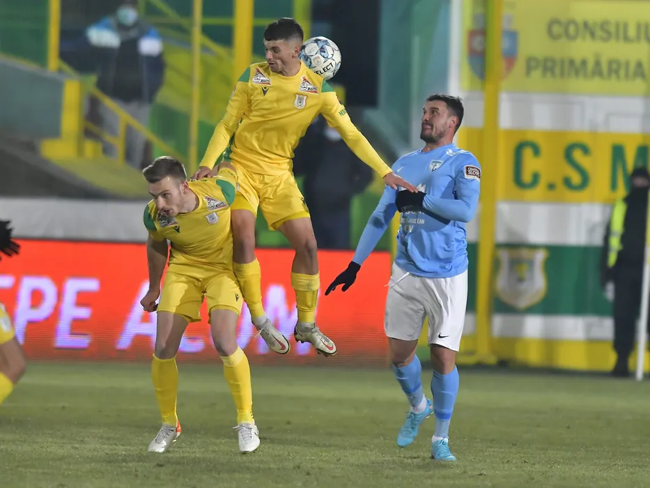 Adrian Blazej Cierpka, Constantin Valentin Budescu si Gabriel Dorinel Oancea in meciul de fotbal dintre CS Mioveni si FC Voluntari, contand pentru Liga 1 Casa Pariurilor, desfasurat pe Stadionul Orasenesc din Mioveni, vineri 4 februarie 2022. © FOTO:Razvan Pasarica/SPORT PICTURES