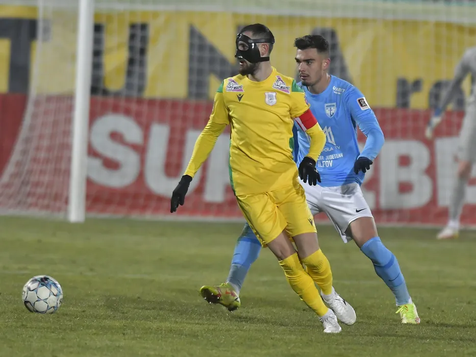 Gheorghe Bogdan Rusu si Denis Ciobotariu in meciul de fotbal dintre CS Mioveni si FC Voluntari, contand pentru Liga 1 Casa Pariurilor, desfasurat pe Stadionul Orasenesc din Mioveni, vineri 4 februarie 2022. © FOTO:Razvan Pasarica/SPORT PICTURES