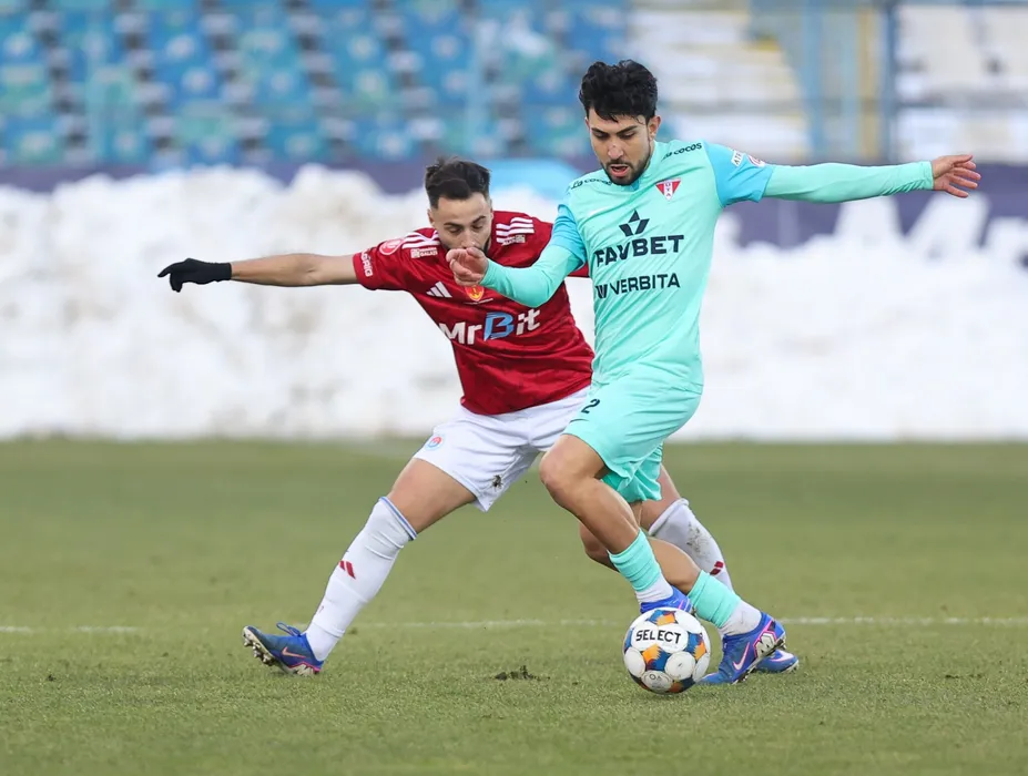 Mark Tutu si Virgil Andrei Ciobanu in meciul de fotbal dintre SC Otelul Galati si UTA Arad, contand pentru Superliga Superbet, desfasurat pe Stadionul Otelul din Galati, vineri 20 februarie 2026. © FOTO:Sorin Pana/SPORT PICTURES
