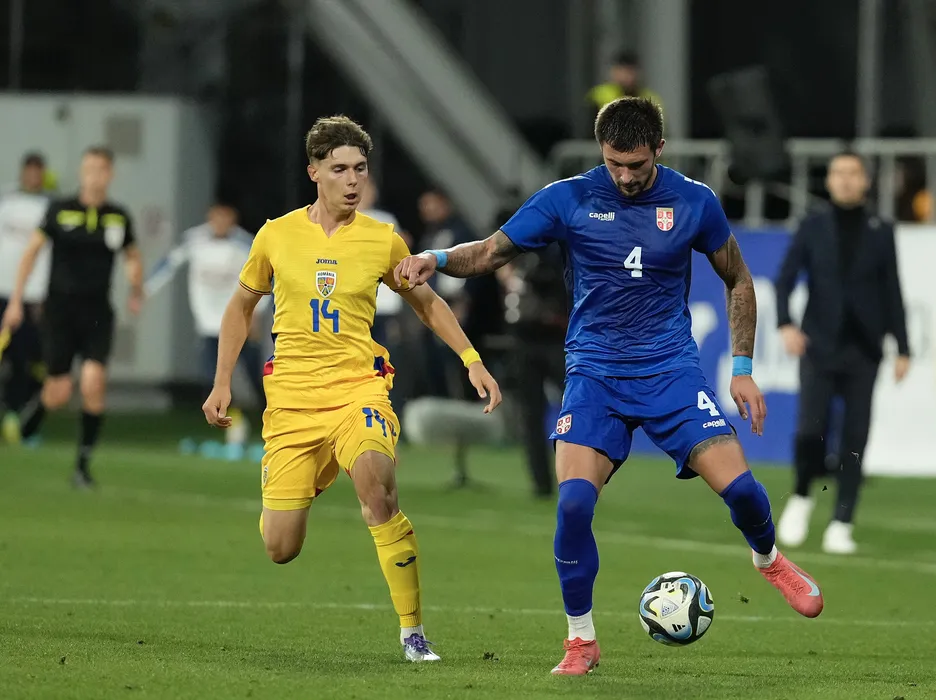 Bojan Kovačević si Rares Pop in meciul amical de fotbal dintre Romania U21 si Serbia U21, desfasurat pe Stadionul Francisc Neuman din Arad, vineri 10 octombrie 2025. © FOTO:Alexandra Fechete/SPORT PICTURES