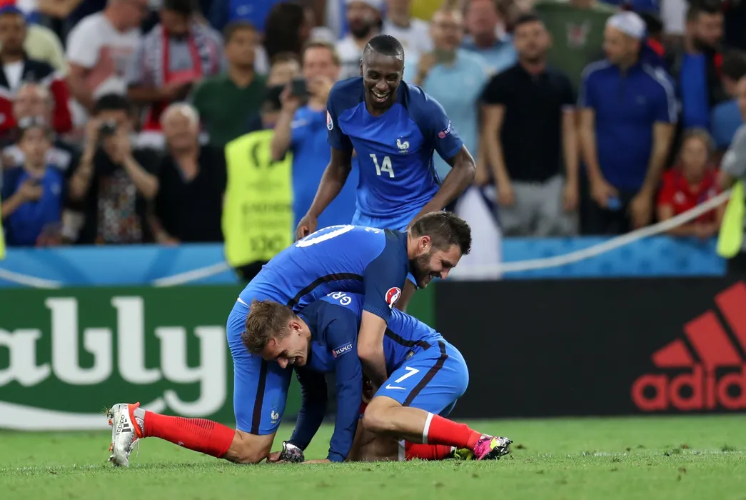 MARSEILLE, FRANCE - JULY 7: Blaise Matuidi (14), Antoine Griezmann and Andre-Pierre Gignac of France celebrate their victory over Germany following the UEFA Euro 2016 semi final match between Germany and France at Stade Velodrome in Merseille, France on July 7, 2016. Metin Pala / Anadolu Agency