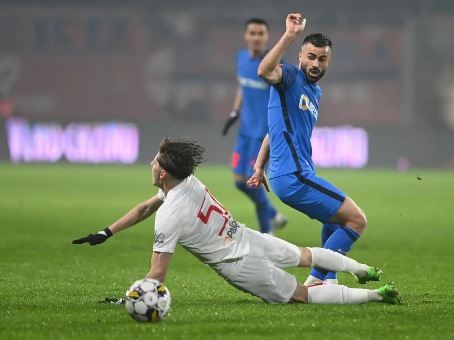 Alexandru Laurentiu Oroian si Valentin Cretu in meciul de fotbal dintre FC Hermannstadt si FCSB, contand pentru Superliga Superbet, desfasurat pe Stadionul Municipal din Sibiu, duminica 22 ianuarie 2023. © FOTO:Razvan Pasarica/SPORT PICTURES