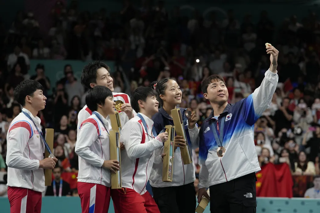 South Korea's Lim Jonghoon, right, takes a selfie with North Korea's Ri Jong-sik, left, and Kim Kum Yong, second left, China's Wang Chuqin, background, and Sun Yingsha, center, and his teammate Shin Yubin, right, during the medal ceremony at the 2024 Summer Olympics, Tuesday, July 30, 2024, in Paris, France.,Image: 894633361, License: Rights-managed, Restrictions: This content is intended for editorial use only. For other uses, additional clearances may be required., Model Release: no, Pictured: Chuqin Wang