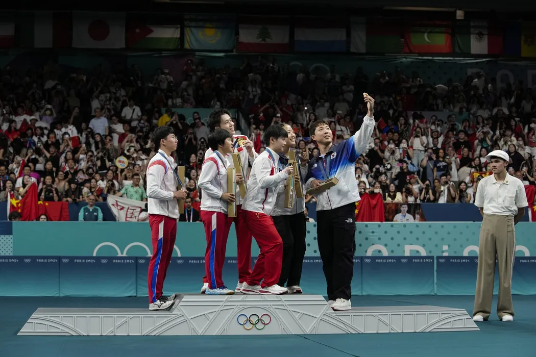 South Korea's Lim Jonghoon, right, takes a selfie with North Korea's Ri Jong-sik, left, and Kim Kum-yong, second left, China's Wang Chuqin, background, and Sun Yingsha, center, and his teammate Shin Yubin, right, during the medal ceremony at the 2024 Summer Olympics, Tuesday, July 30, 2024, in Paris, France.,Image: 894636048, License: Rights-managed, Restrictions: This content is intended for editorial use only. For other uses, additional clearances may be required., Model Release: no, Pictured: Chuqin Wang