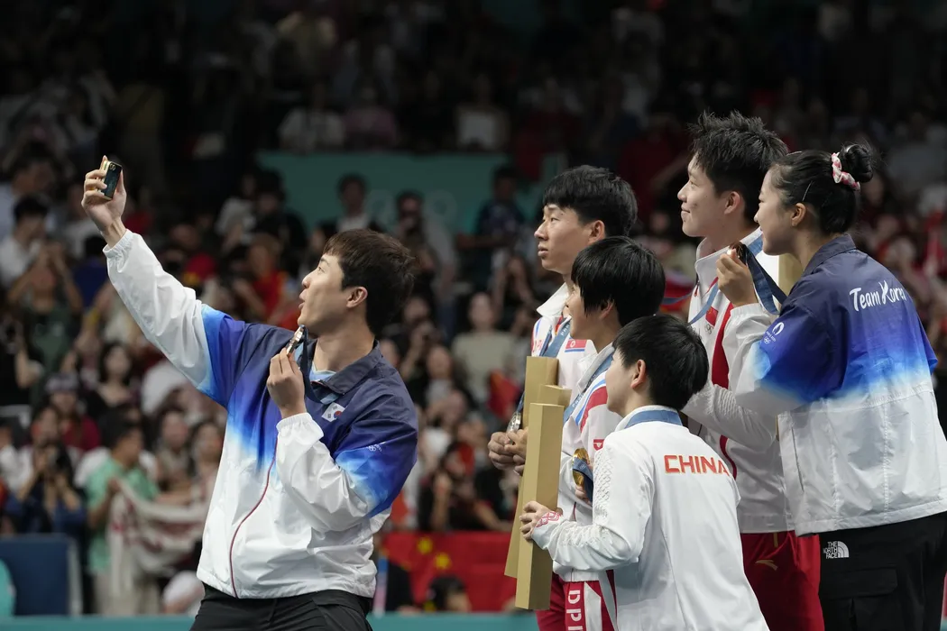 South Korea's Lim Jonghoon, left, takes a selfie with North Korea's Ri Jong-sik, second left, and Kim Kum-yong, third left, China's Wang Chuqin, second right, and Sun Yingsha, this right and his teammate Shin Yubin, right, during the medal ceremony at the 2024 Summer Olympics, Tuesday, July 30, 2024, in Paris, France.,Image: 894635605, License: Rights-managed, Restrictions: This content is intended for editorial use only. For other uses, additional clearances may be required., Model Release: no, Pictured: Chuqin Wang