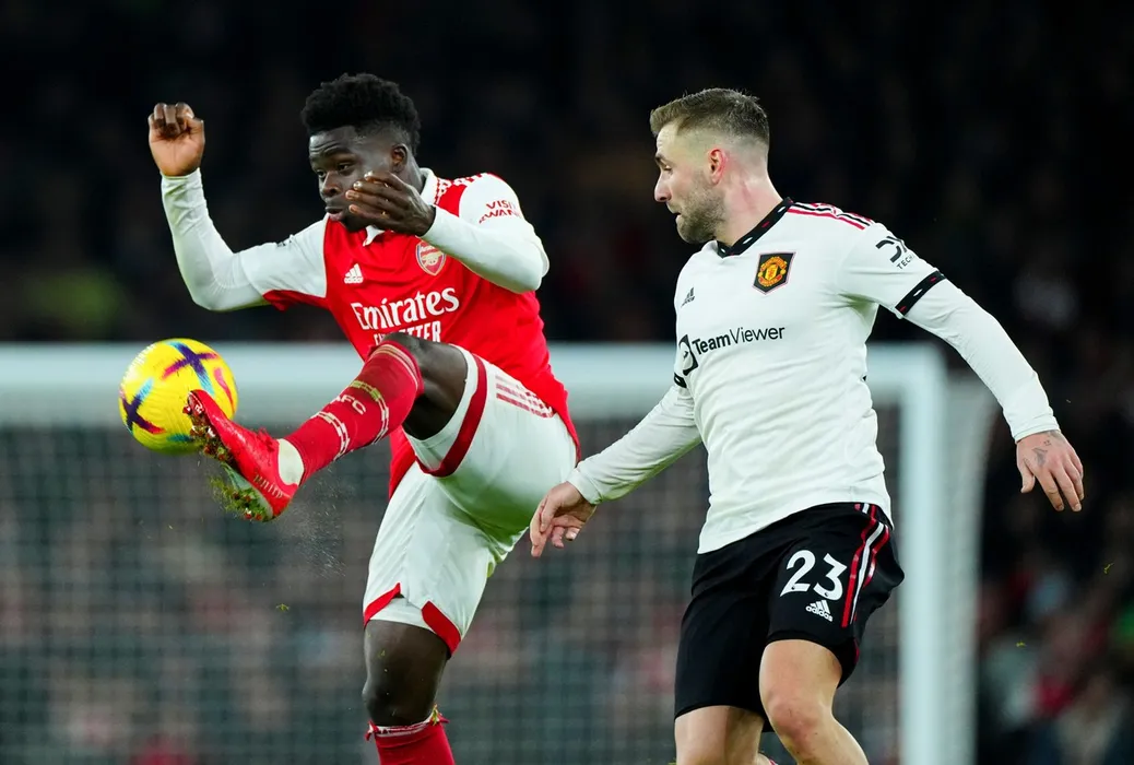 Bukayo Saka of Arsenal battles with Luke Shaw of Manchester United