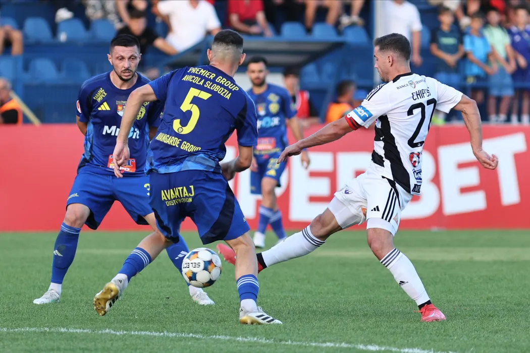 Mihaita Alexandru Chipciu si Florin Flavius Purece, Valon Hamdiji in meciul de fotbal dintre AFC Unirea 04 Slobozia si FC Universitatea Cluj, contand pentru Superliga Superbet, desfasurat pe Stadionul Clinceni Arena din Clinceni, sambata 30 august 2025. © FOTO:Gheorghe Fluster/SPORT PICTURES
