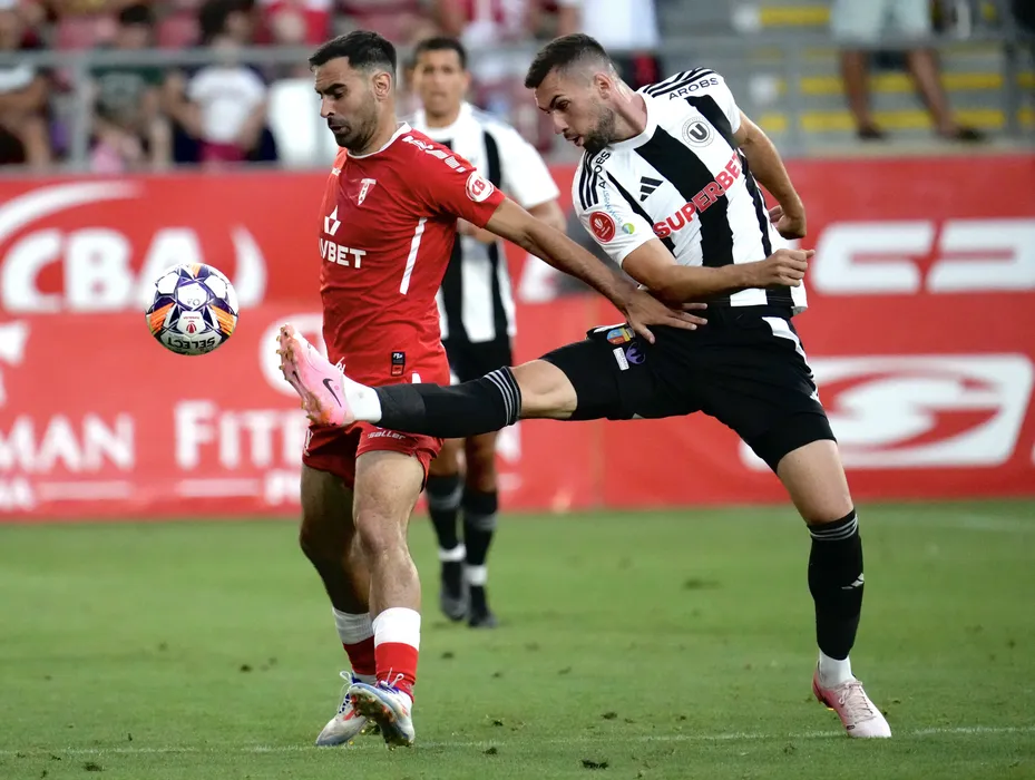 Benjamin Andre P Van Durmen și Dorin Marian Codrea în meciul de fotbal dintre UTA Arad si FC Universitatea Cluj, contând pentru Superliga Superbet, desfășurat pe Arena Francisc Neuman din Arad, luni 29 iulie 2024. © FOTO: Alexandra FECHETE/SPORT PICTURES