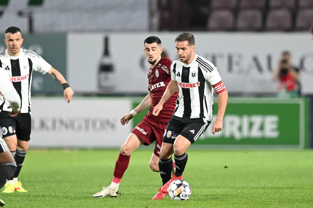 Meriton Korenica si Mihaita Alexandru Chipciu în meciul de fotbal dintre CFR Cluj si Universitatea Cluj, contând pentru Play off-ul Superligii Superbet, desfășurat pe Stadionul Dr. Constantin Raduescu din Cluj Napoca, sambata 3 mai 2025. © FOTO: Flaviu Buboi/SPORT PICTURES
