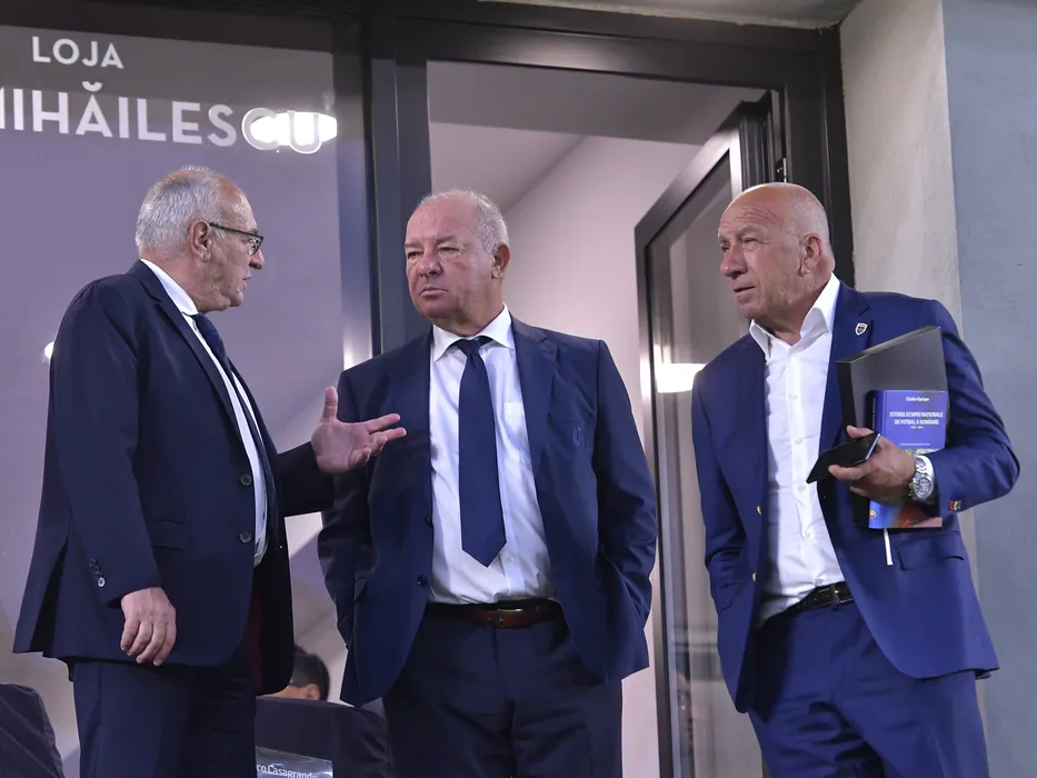 Octavian Goga discuta cu Gheorghita Geolgau si Ionel Augustin in tribuna la meciul de fotbal dintre Romania si Finlanda, contand pentru Liga Natiunilor, desfasurat pe Stadionul Rapid Giulesti din Bucuresti, sambata 11 iunie 2022. © FOTO:Razvan Pasarica/SPORT PICTURES