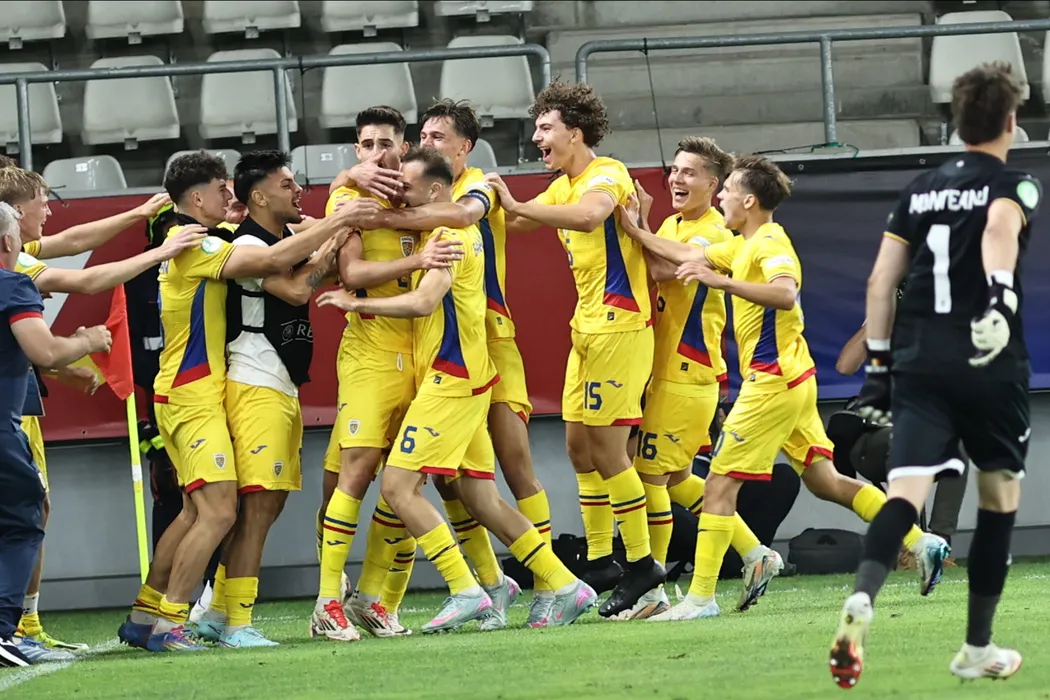 Fotbalistii romani se bucura dupa un gol marcat in meciul de fotbal dintre Romania U19 si Muntenegru U19, contand pentru Campionatul European U19, desfasurat pe Stadionul Arcul de Triumf din Bucuresti, vineri 13 iunie 2025. © FOTO: Gheorghe Fluster/SPORT PICTURES