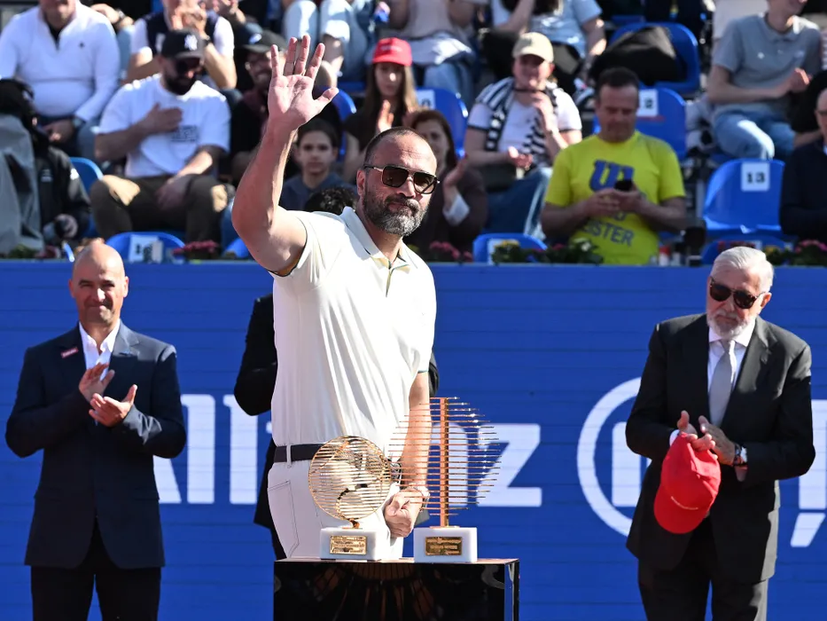 Ion Ion Tiriac saluta publicul de la microfon dupa meciul de tenis masculin dintre Daniel Merida Aguilar si Mariano Navone, finala de simplu ATP Tiriac Open 2026, desfasurat la Centrul National de Tenis Simona Halep din Bucuresti, duminica 5 aprilie 2026. © FOTO:Razvan Pasarica/SPORT PICTURES
