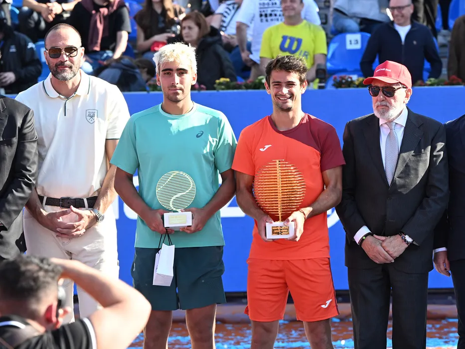 Mariano Navone si Daniel Merida Aguilar pozeaza alături de trofee, Ion Ion Tiriac si Ilie Nastase, dupa meciul lor de tenis masculin, finala de simplu ATP Tiriac Open 2026, desfasurat la Centrul National de Tenis Simona Halep din Bucuresti, duminica 5 aprilie 2026. © FOTO:Razvan Pasarica/SPORT PICTURES