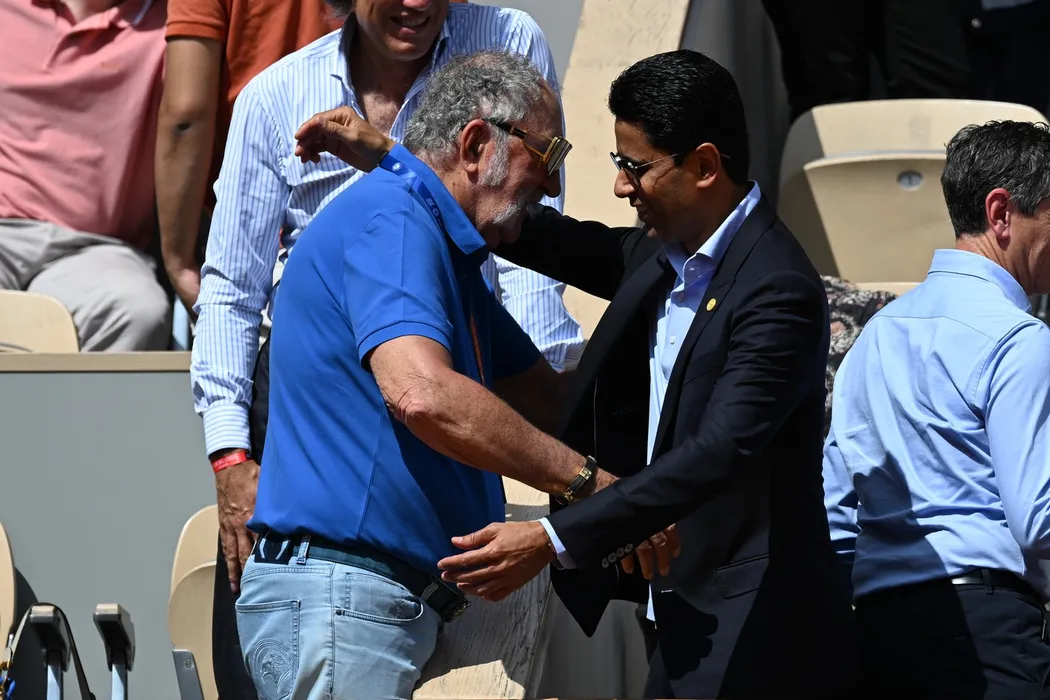 Ion Țiriac and President of Paris Saint Germain Nasser Al Khelaifi during an event to present the UEFA Champions League trophy on Court Philippe-Chatrier during French Open tennis tournament on day 9 at the Roland-Garros Complex in Paris, France on June 2, 2025.,Image: 1006211048, License: Rights-managed, Restrictions: , Model Release: no