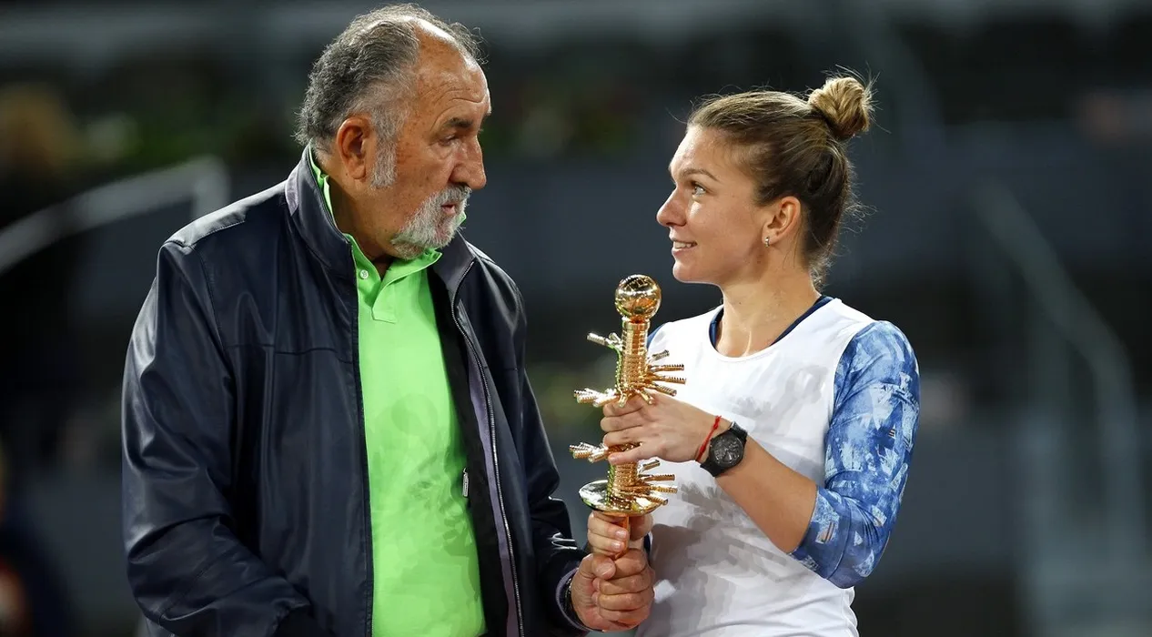 Simona Halep of Romania celebrates becoming Champion with the trophy and Ion Tiriac at the Mutua Madrid Open, Madrid, Spain on Saturday, May 13th, 2017