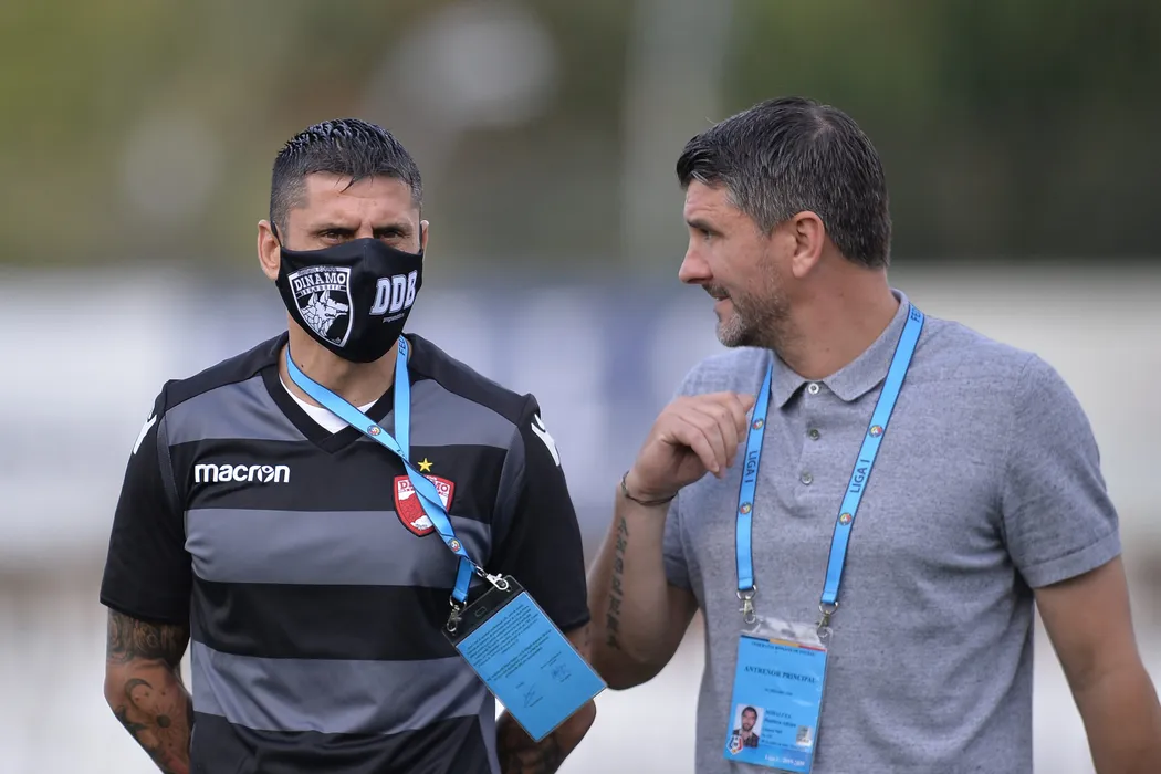 Ionel Danciulescu si Adrian Mihalcea inainte de inceperea meciului de fotbal dintre Dinamo si CSM Politehnica Iasi din etapa 9 a play-off-ului Ligii 1 Casa Pariurilor, disputat pe stadionul Dinamo din Bucuresti, duminica, 12 iulie 2020. ALEXANDRU DOBRE / MEDIAFAX FOTO