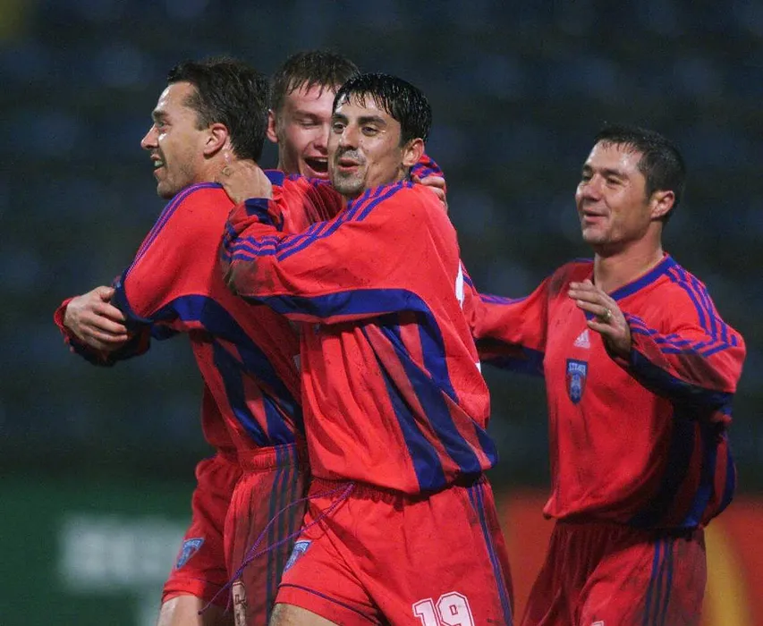 De la stanga la dreapta, Laurentiu Rosu, Cristian Ciocoiu, Ionel Danciulescu si Sabin Ilie de la Steaua Bucuresti intr-un moment de bucurie dupa deschiderea scorului de catre Rosu in meciul dintre Steaua Bucuresti si West Ham United, meci incheiat cu scorul de 2-0 in favoarea romanilor.21Oct.1999