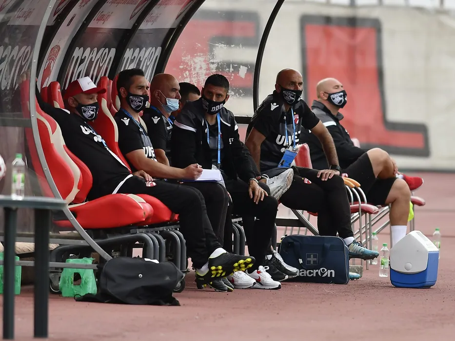 Banca dinamovista cu Ionel Danciulescu si Liviu Batineanu in meciul de fotbal dintre Dinamo Bucuresti si FCSB, contand pentru turul semifinalei Cupei Romaniei, disputat fara spectatori pe Stadionul Dinamo din Bucuresti, joi 25 iunie 2020. © FOTO:Razvan Pasarica/SPORT PICTURES
