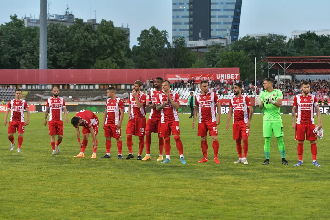 Fotbalistii dinamovisti la startul meciului de fotbal dintre Dinamo Bucuresti si UTA Arad, contand pentru Play-out-ul Ligii 1 Casa Pariurilor, desfasurat pe Stadionul Dinamo din Bucuresti, vineri 13 mai 2022. © FOTO:Razvan Pasarica/SPORT PICTURES