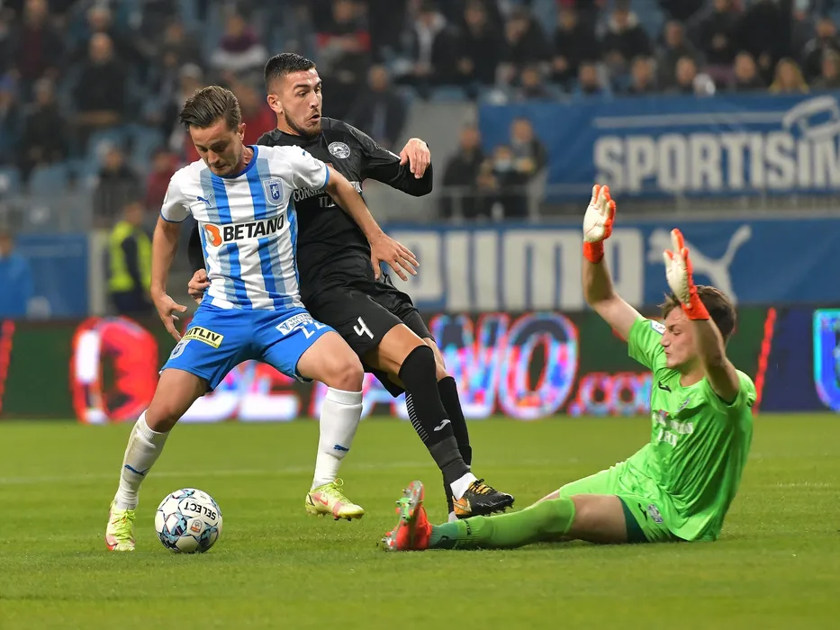 Gustavo Vagenin, Amir Bilali si Stefan Emilian Dobre in meciul de fotbal dintre Universitatea Craiova si Academica Clinceni, contand pentru Liga 1 Casa Pariurilor, desfasurat pe Stadionul Ion Oblemenco din Craiova, luni 18 octombrie 2021. © FOTO:Razvan Pasarica/SPORT PICTURES
