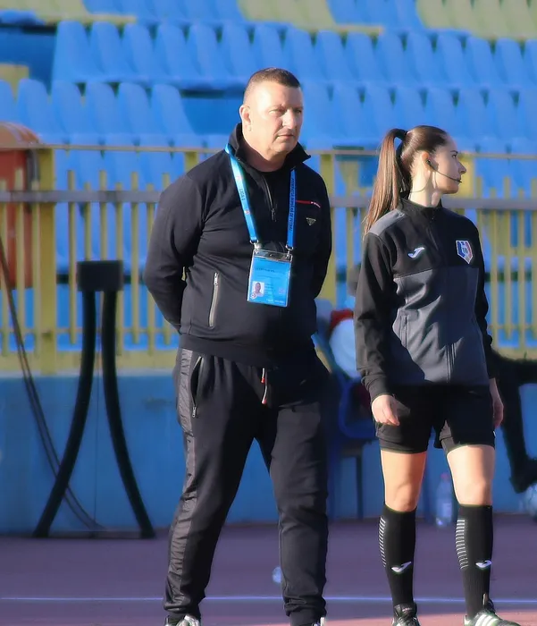 Ionut Chirila si Arbitrul de rezerva Demetrescu Iuliana Elena in meciul de fotbal dintre Gaz Metan Medias si Academica Clinceni, contand pentru Liga 1 Casa Pariurilor, desfasurat fara spectatori pe Stadionul Municipal din Medias, duminica 31 octombrie 2021. © FOTO:Valentin Macrea/SPORT PICTURES