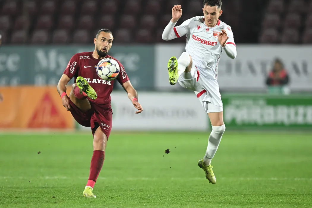 Virgiliu Postolachi si Raul Marian Oprut in meciul de fotbal dintre FC CFR 1907 Cluj si Dinamo Bucuresti, contand pentru Superliga Superbet, desfasurat pe Stadionul Dr.Constantin Radulescu din Cluj-Napoca, sambata 15 martie 2025. © FOTO: Flaviu Buboi/SPORT PICTURES